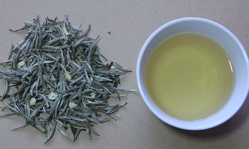 茉莉銀針:呈條索狀,緊細如針,采用白毫銀針的早春鮮葉為原料,湯色清澈明亮,香氣鮮爽濃郁,沖泡時茶芽聳立,沉落時雪花下落。